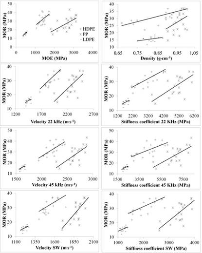Figure 4 shows graphs of MOR as a function of density, MOE, wave velocities, and stiffness coefficients with the regression line for each group of composites of the same matrix. The regression coefficients are smaller than those obtained for the estimates of MOE but demonstrate that part of the variation of MOR can also be explained by the variation in these properties.
