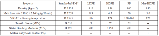 Three kinds of polymers were used in the matrix phase composites: high-density polyethylene (HDPE); a 50/50 mix of virgin and recycled, low-density polyethylene, (LDPE), and polypropylene (PP). Also, were used a coupling agent MA-HDPE, that a HDPE graphitized maleic anhydride. Their properties are shown in Table 1.