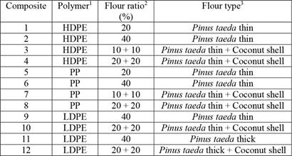 Coconut shell flour coconut (Cocos nucifera L.) and two different grain sizes (thick and thin) Loblolly pine taeda (Pinus taeda L.) wood flour were used. The thick-grain wood flour was obtained from forest industry waste, while the thin-grain flour and thin coconut shell flour were provided by a company that produces the material. The particle diameter for each type of flour, whose volume is equal to the average volume of all particles, was 0,0143 mm, 0,0196 mm, and 0,2599 mm for coconut shell, thin-, and thick-grain pine, respectively.