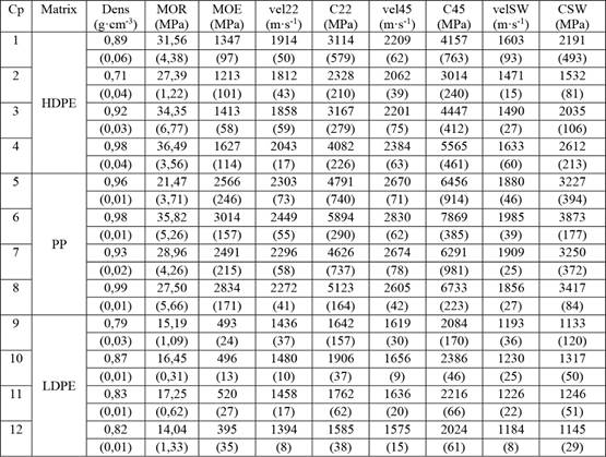 The specimens presented mechanical and acoustic properties that were mainly determined by the type of matrix used in the composite. The composites produced with polypropylene presented greater stiffness and higher values of wave velocity, followed by those made with high-density polyethylene and low-density polyethylene.
