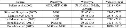 Han, G.; Wu, Q.; Wang, X. 2006. Stress-wave velocity of wood-based panels: Effect of moisture, product type, and material direction. Forest Products Journal 56(1): 28-33. https://www.fs.usda.gov/treesearch/pubs/22992