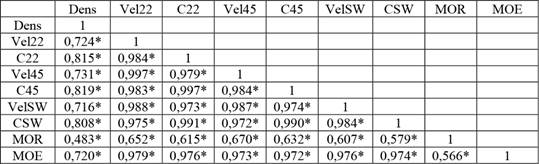 Table 5 shows the Pearson correlation coefficient between the analyzed properties of the composite specimens. There was a significant correlation between all evaluated properties, with a strong correlation among the three types of waves evaluated and between wave type and MOE. Furthermore, a strong correlation was observed between the wave velocity or stiffness coefficient and MOE.