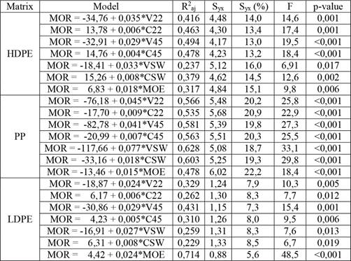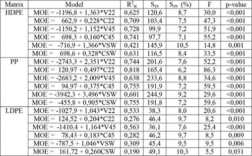 Table 6 presents the linear regression equations of MOE as a function of the wave velocity and stiffness coefficient for each composite group of the same matrix. The results show an estimated standard error of less than 11 %, which is low and indicates the applicability of acoustic techniques to estimate MOE.