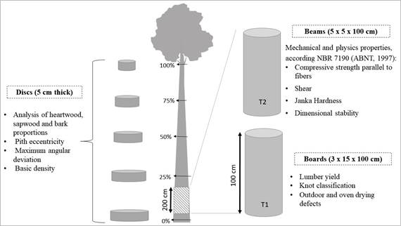 From each genetic material, six individuals were selected, totaling 18 trees. The diameter at breast height (DBH) of each of these trees was measured. After cutting, the total and commercial heights were measured, with the first bifurcation of the trunk considered for the latter. Wood sampling in each tree is shown in Figure 1.