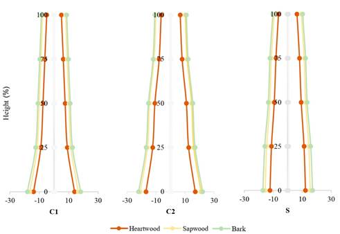 There were no significant differences (p < 0.05) among the three genetic materials for total percentage of heartwood and sapwood, which presented mean values of 46,16% and 39,53%, respectively. Figure 2 shows the average values of heartwood, sapwood and bark along the trunk of C1, C2 and S teak trees. Benedetti (2018) verified 47,99% heartwood in seminal teak at 14,4 years and Oliveira et al. (2019) found 15,24% higher heartwood production than that of seminal material when comparing seminal and clonal teak. Thus, the three materials had satisfactory heartwood development for about 15-year-old material, with values similar to those found in 30-year-old teak trees (maximum of 55% heartwood) (Pérez and Kanninen 2003).