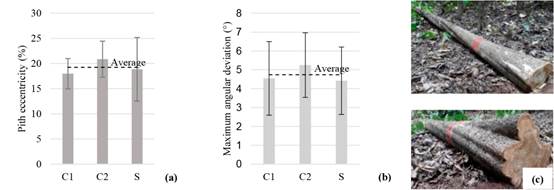 Average values of pith eccentricity and maximum angular deviation of wood from materials C1, C2 and S are presented in Figure 3.