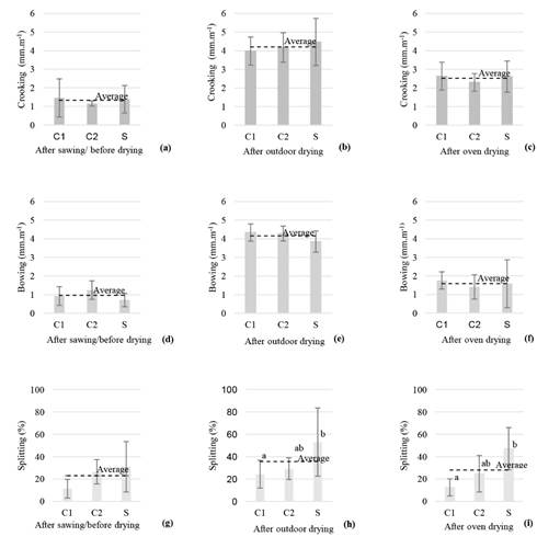 Defects were greater after drying (Figure 4), when compared to defects after sawing. There were no significant differences (p < 0,05) for warping between the three materials in outdoor drying, and the average crooking and bowing were 4.20 mm·m-1 and 4.04 mm·m-1, respectively.