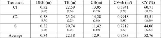 There were no statistical differences (p < 0,05) for variables DBH, TH, CH, CVwb, and CY (Table 1).