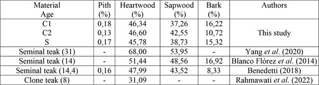 Blanco-Flórez et al. (2014) obtained an average bark value of 16,92%, which is close to the C1 material. However, herein, the bark values for the three materials were lower than those found by Pérez and Kanninen (2003), who verified 20% bark for teak trees between 10 and 15 years of age.