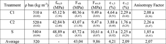 Nogueira (2007) affirmed that the grain inclination significantly interferes with the mechanical properties of wood at different magnitudes, which was verified herein with an inverse correction of 0,60 for these variables. The C2 material presented the highest grain angulation (5,25°) (Figure 3b), and the lowest compressive strength value parallel to the fibers (Table 3), while the seminal material presented the lowest grain inclination (4,42°) (Figure 3b), and higher compression strength parallel to the fibers (Table 3).