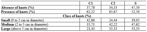 Table 4 shows the percentage of boards with and without knots along with knot classification according to Arruda (2013).