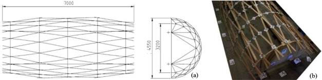 La estructura analizada fue una ELRM deformada elásticamente construida a partir de tres direcciones de listones curvados de madera de eucalipto (Eucalyptus globulus Labill.) La fotogrametría se aplicó para comparar la superficie de la estructura antes y después de ser cargada. El proceso constructivo de este prototipo se presentó en (Lara-Bocanegra et al. 2022), incluyendo el modelo numérico y un método novedoso de curvado. Sus dimensiones están recogidas en la Figura 1.