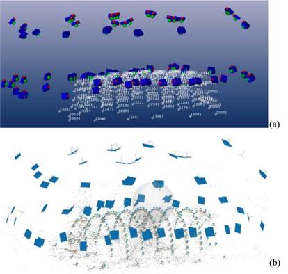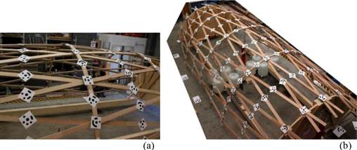Se tomaron 165 fotografías sobre la estructura sin carga, y 93 bajo carga. El tiempo de computación de todas ellas no superó un día. En ambos casos resultaron suficientes para estimar las coordenadas de las dianas. Una buena redundancia de imágenes se logró con las 165 fotos en pre-carga, mientras que las 93 bajo carga fueron insuficientes para modelar toda la superficie exterior de los listones de madera, como se aprecia en la Figura 10.