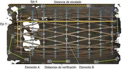 Se utilizaron dianas codificadas de 14 bits y 150 mm de diámetro, tamaño adecuado para que el software las identifique fácilmente en las fotografías. Para proporcionar una redundancia de datos que favorezca la precisión dimensional del modelo 3D generado, se colocó una cantidad de dianas superior a la mínima necesaria para contribuir a la orientación de las fotografías. Se instalaron sobre los nudos de la estructura, en los puntos intermedios de los elementos de madera entre los nudos, en las caras exteriores de las planchas semicirculares de cada extremo y, para usar como referencia por permanecer inmóviles durante la carga, sobre el suelo y las vigas principales. Algunas dianas fueron adoptadas como puntos de control- además de contribuir a la redundancia de datos-, utilizándose para escalar, trasladar y rotar el modelo 3D. En concreto, se usaron tres dianas para la traslación y rotación, y dos dianas para el escalado. Para evaluar la precisión del modelo 3D, cinco distancias entre diez dianas sobre puntos inmóviles fueron empleadas como puntos de verificación, se compararon las distancias medidas sobre la escena con el flexómetro con las medidas sobre el modelo.