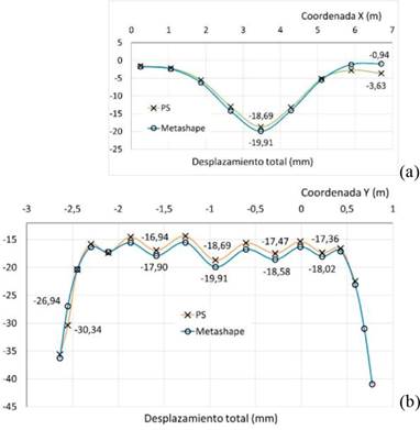 Los desplazamientos totales medidos sobre las dianas en los elementos A y B casi convergen en ambos programas, como se aprecia en la Figura 7. Sobre el elemento A, el promedio de las diferencias entre PS y Metashape es de 0,47 mm. Sobre el elemento B, este promedio es de sólo 0,05 mm. En la Figura 7a se aprecia una menor simetría en la gráfica reportada por PS. La razón puede deberse al modo en el que cada software genera el modelo: PS lo hace en base a la localización de las dianas, mientras que Metashape, como programa SfM, utiliza toda parte de cada foto que pueda ser identificable en otras fotos, usando la identificación de dianas de manera complementaria. La cantidad de fotos en estado cargado, especialmente en la mitad derecha de la estructura, afectaría a la generación del modelo en PS.