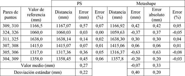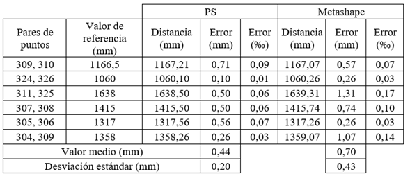 Los errores reportados en las Tabla 1 y Tabla 2 validan los respectivos modelos 3D generados por fotogrametría, aunque hay que tener en cuenta que la fiabilidad de los modelos generados dependerá también de la tolerancia de ruido adoptada por el algoritmo que caracterice parámetros estructurales (Casero et al. 2020). Pese a que el número de puntos y distancias de control no es elevado, los resultados obtenidos muestran que ambos softwares logran una calidad de medida similar, con una exactitud (0,70 - 0,072 mm) del orden de entre 1:10995 y 1:106900 respecto a la diagonal (7696,8 mm) de la base del objeto.
