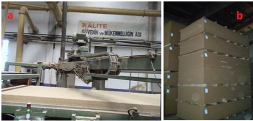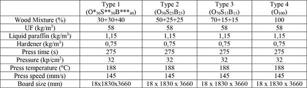 Boards were produced in Divapan Entegre Plant, Düzce, Türkiye. As seen in Table 2, four different board types were manufactured in terms of oak utilization percentages. Each wood species was separately chipped, stored, and fed to production as presented percentages by the discharge screw. An oscillating screen was used for chip screening. Pre-steaming was performed using 140 ºC temperature and 2,7 bar steam pressure in the chip bin to ensure precise and balanced chip discharge and uniform moisture. Before the defibrillation process, liquid paraffin was applied to the chip mixtures by the discharge screw. Chips were cooked for around 3 min at 185 ºC temperature and 7,8 bar steam pressure. Asplund defibrillator refiner and Andritz defibrillator (Andritz AG, Graz, Austria) were used in these phases. Chemicals were applied and then fibers were dried till their moisture reached 12 %. Homogenous and uniform mats were coldly pre-pressed using 110 kg/cm² - 90 kg/cm² - 105 kg/cm² pressures. The 1860 mm x 3690 mm rough-sized mats were hot pressed using a multi-layer (8) press. As seen in Table 2, pressing parameters were fixed for all groups.