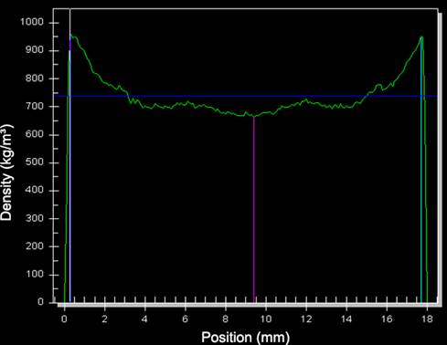 The uniform density profile across the thickness of the board is presented in Figure 3, and as Xie et al. (2011) expressed, repeatedly fluctuating density across the thickness partially demonstrates the cross-linked layered structure of fiber dispersion across the thickness.