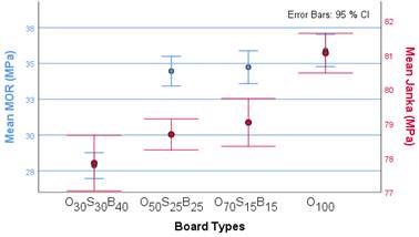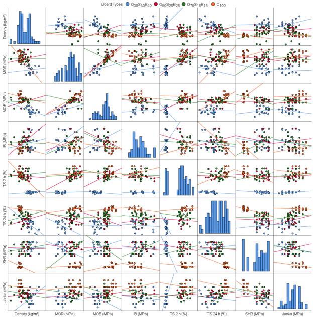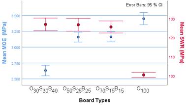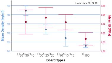 Mean physical and mechanical values and error bars for graphical expression or comparison of the data variations are presented in Figures 4-7. Also, a scatterplot matrix, seen in Figure 8, presents all the pair-wise scatter plots of evaluated variables for the MDF production.