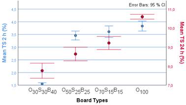 As seen in Table 3, the 2 h immersion in water provided 1,5 % to 3,8 % swelling percentages while 24 h caused higher swelling percentages that ranged from 7,75 % to 10,6 %. Furthermore, the means presented statistically significant differences. As in density variations, boards produced using only oak fiber presented the highest swelling percentages. Contrary, boards with the lowest oak share (30 %) provided the lowest TS. The same is true for the 2 h immersion process however there were no statistically significant differences between O50S25B25 and O70S15B15, and O70S15B15 and O100. Furthermore, TS 2 h and 24 h of O100 boards were around 2,5 and 1,4 times higher than O30S30B40 boards. Therefore, O30S30B40 composition for the board production can be chosen when TS performance is taken into consideration. When reported TS percentages, 3,81 % for 2 h (Çamlıbel and Akgül 2020), and 9,5 % (Akgül et al. 2013) to 28,81 % (Çamlıbel 2020) for 24 h, are taken into consideration for the boards produced using mixed oak fiber, results of this study are fair enough.