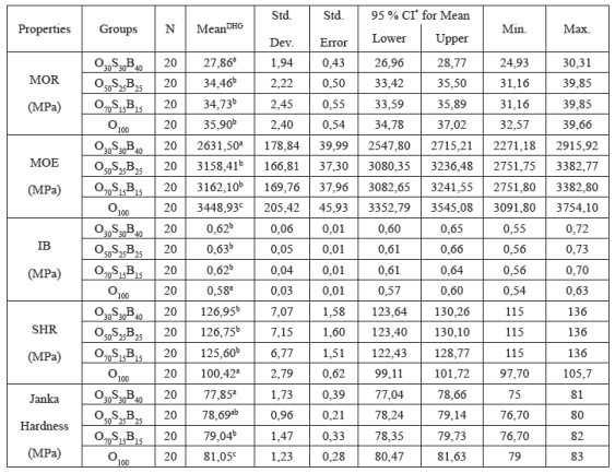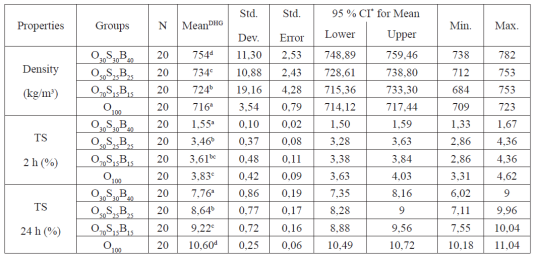 The means and statistics for the mechanical properties are presented in Table 4. Both MOR and MOE in bending were increased with the increase in oak fiber percentage. Furthermore, values reached their maximum when boards were produced using only oak fiber. Around 28,9 % and 31,1 % increases were observed in MOR and MOE in bending values. According to DMRT, only O30S30B40 board presented statistically significant differences for MOR, and there were no statistically significant differences between O50S25B25 and O70S15B15 for MOE in bending. When considering MOR and MOE improvements, boards should be produced using oak wood instead of blending these tree species. However, the lowest IB strength was obtained when the boards were produced without any mixture. Additionally, the highest IB strength was obtained when the board composition was O50S25B25. However, as seen in the table, there was only a 7,9 % difference between the highest and lowest values. There were insignificant statistical differences between the means of boards that were produced using a mixture of soft and hardwoods. Furthermore, the IB strengths of the boards composed of the blended chips did not present stable increases or decreases. As seen in Table 5, the results of this study conform to the reported MOR, MOE, and IB values ranging from 21,97 MPa to 36,89 MPa, 2628 MPa to 4248 MPa, and 0,49 MPa to 0,66 MPa, respectively.