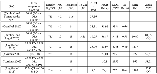 The effect of final board density on thickness swelling-TS (2 h and 24 h), Modulus of Rupture (MOR), Modulus of Elasticity (MOE), Internal Bonding (IB) strength, and Janka hardness properties (Akgül et al. 2007), roughness properties of commercial MDF (composed of oak, beech, and pine fiber mixture) (Akbulut and Koç 2006), wettability and surface roughness (Akgül et al. 2012), effect of calcite on color, water absorption (WA), TS, toluene percentage on the surface, MOE, MOR, IB, screw holding resistance (SHR), Janka hardness of MDF composed of oriental beech (Fagus orientalis), oak (Quercus robur), and scotch pine (Pinus sylvestris) fibers (Çamlıbel and Akgül 2020), influence of zeolite (3 %, 6 %, and 9 % wt.) on density, moisture content (MC), TS, WA, MOR, MOE, IB, and formaldehyde emission (FE) of 14 mm thick MDF produced using 70:30 mixture of hardwood beech (Fagus orientalis) and oak (Quercus robur L.) and softwood scotch pine (Pinus sylvestris), respectively (Camlıbel 2020), comparison of TS, WA, MOR, MOE, IB, SHR properties of MDFs produced using a 30:35:35 fiber mixture of scotch pine (Pinus sylvestris), beech (Fagus orientalis), and oak (Quercus robur), respectively and agri-based biomass added (20 % wt.) boards using okra and tobacco stalks, hazelnut and walnut shell, and pinecone, respectively (Akgül et al. 2017), impact of tree species oak (Quercus robur), beech (Fagus orientalis), and black pine (Pinus nigra) and their mixtures (40 %, 40 %, 20 %, respectively) on the MOE, TS, SHR, and Janka hardness (Ayrılmış 2002), evaluation of fungal decay resistance of MDF produced using black pine (Pinus nigra), beech (Fagus orientalis), and oak (Quercus robur) furnishes, and the mixture of these species (20 %, 40 %, and 40 %, respectively) (Kartal and Green 2003), influence of burned pine and unburned beech and oak utilization on the density, MOR, MOE, IB, SHR, TS, Janka hardness, surface roughness, and color properties (Akgül et al. 2013), production of eco-friendly MDF using a 57:35:8 mixture of european beech (Fagus sylvatica), oak (Quercus robur), and silver poplar (Populus alba) fibers, respectively (Savov and Antov 2020) and mixture of scotch pine (Pinus sylvestris) and Norway spruce (Picea abies) (Antov et al. 2021) fibers for the determination of WA, TS, MOR, MOE, and IB, and influence of hot-pressing parameters on the WA, TS, MOR, MOE, IB of eco-friendly MDF composed of 60:20:20 mixture of European beech (Fagus sylvatica), oak (Quercus cerris), and silver poplar (Populus alba) fibers, respectively (Valchev et al. 2021), the effect of modified bonding application on the WA, TS, MOE, MOR, and IB for MDF composed of a 20:20:60 mixture of beech, oak, and pine fibers, respectively (Savov et al. 2022) were reported.
