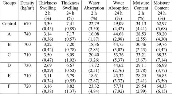 Similar results have been reported by other researchers. According to Hansted et al. (2019), adding nanocellulose to medium density particleboard panels resulted in no statistically significant variation in moisture content.