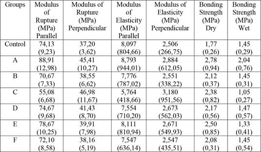 Except for the panels reinforced with Group C and E, the pre-treated sample (wet) values of the plywood panels had higher bonding strengths than the unreinforced panels. With Group A, the biggest improvement was 40,68 %. Wetting pre-treatment Group A panels demonstrated sufficient water resistance, as wet bonding strength was equivalent to dry bonding strength.