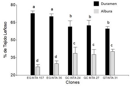 Los clones puros arrojaron una mayor proporción de duramen respecto a los híbridos. Esto es interesante desde el punto de vista de la producción de volumen de este tipo de tejido, aunque su densidad fue menor, principalmente para el clon EG INTA 157, por lo que podría destinarse para usos no estructurales como apariencia y mueblería.