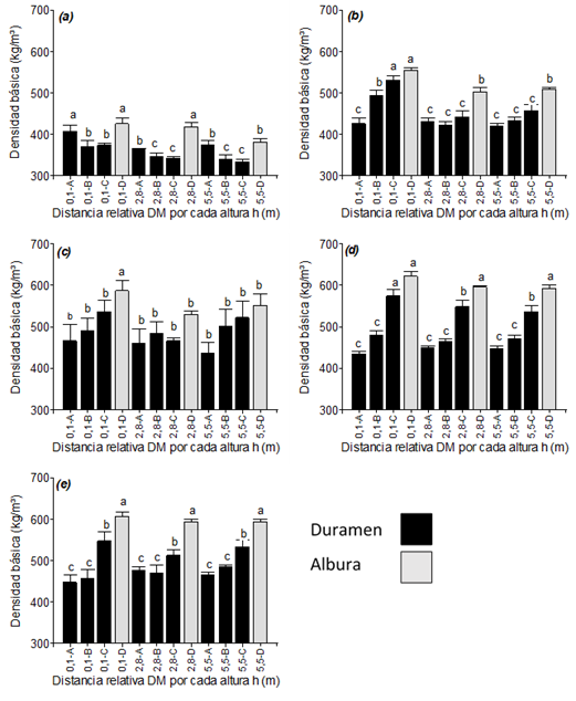 En la Figura 2 se compara la tendencia de la Db para cada clon, en el sentido radial y axial, discriminado por tipo de tejido (duramen y albura). Se observa que para todos los materiales genéticos estudiados la densidad básica de la albura (posición radial D) fue mayor que la del duramen, independientemente de la altura de fuste, mostrando diferencia significativa (p < 0,05) para todos los materiales genéticos. Cherelli et al. (2018) y Almeida et al. (2020) lograron patrones radiales similares y atribuyeron este comportamiento a la temprana edad de los individuos, debido a los cambios fisiológicos del meristema cambial. Con la edad, la diferenciación celular favorece los requerimientos mecánicos en desmedro de la conducción, las fibras engrosan su pared celular y disminuye la frecuencia de los vasos (Sette Jr. et al. 2012).