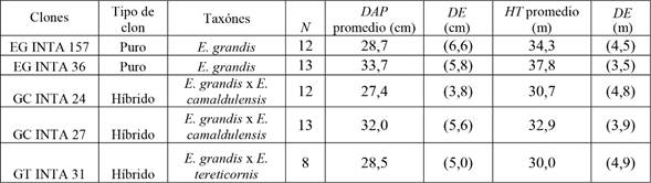 En el marco de las investigaciones sobre nuevos materiales genéticos, el Instituto Nacional de Tecnología Agropecuaria (INTA) de Argentina, ha desarrollado numerosos clones híbridos interespecíficos de Eucalyptus que se encuentran en diferentes etapas de evaluación. López et al. (2016) estudiaron la variación genética para muchos de estos materiales en Entre Ríos, a edades tempranas, generando así los primeros antecedentes, constatando algunas diferencias tecnológicas entre los materiales puros e híbridos.
