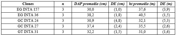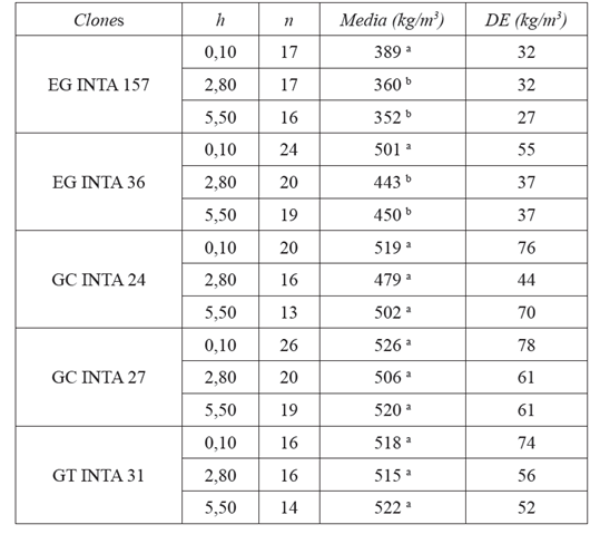 Con respecto a las alturas de fuste, en la Tabla 5 se presentan los valores medios de la densidad básica para los distintos clones y alturas de fustes. Si bien Db presentó una tendencia decreciente con h, sólo hubo diferencias estadísticamente significativas entre los valores de densidad en la base del árbol respecto a las otras dos alturas para los clones puros EG INTA 157 y EG INTA 36.