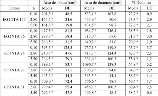 A su vez, se encontraron diferencias estadísticamente significativas entre alturas de fuste para el área de albura y duramen, que se diferencian entre 0,10 m y las dos alturas siguientes (2,80 m y 5,50 m). Con excepción del clon GC INTA 24, donde hubo diferencias significativas entre las tres alturas, esto probablemente debido al hecho de que entre los árboles que conforman esta muestra, existe mayor variación en el DAP respecto de los otros clones. Dado que el análisis de MGL utiliza al árbol como variable de carácter aleatorio esta diferencia se acentúa, por lo que este efecto podría disminuir, si se aumentara el tamaño de la muestra.
