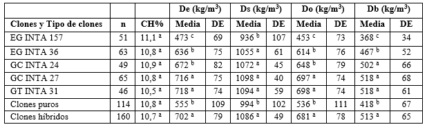 Los distintos tipos de densidades del clon EG INTA 157 fueron en todos los casos inferiores y estadísticamente diferentes de los otros materiales evaluados. Por otro lado, entre los clones GC INTA 27 y GT INTA 31, se observó que no hubo diferencias significativas para los distintos tipos de densidades, pero sí se distinguieron de los demás materiales genéticos arrojando valores medios superiores. Mientras que en la Ds se diferencia el EG INTA 157 de los demás, presentando el menor valor. En cuanto a la densidad básica no se detectaron diferencias estadísticas entre los híbridos, pero sí fueron mayores y distintos que los clones puros. López et al. (2016) obtuvieron valores medios muy similares de Db a partir de tarugos radiales tomados a la altura de pecho, al estudiar los mismos materiales genéticos al 6° año de edad en plantaciones ubicadas en Concepción del Uruguay, Entre Ríos, Argentina. Comparando los valores medios de densidad según tipo de clones (puros o híbridos) los valores de De, Ds, Do y Db de los clones híbridos fueron 25 %, 9 %, 26 % y 22 % respectivamente, más altos que los puros.