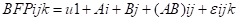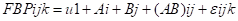 (3)Where FBPijk , SPijk , and BFPijk refer to the cyclic loading performance (N) values of chairs under front to back, side thrust, and back to front loading, respectively; (1 refer to the population means for the cyclic loading performance (N) for all chair design model-panel type combinations, respectively; A refers to the discrete variable representing the effect of chair design model; B refers to the discrete variable representing the effect of panel type; (AB) refers to the effect of the two-way interaction among the two variables; ( refers to the random error term; i refers to the index for chair design model, 1,...,4; j refers to the index for panel type, 1,...,3; and k refers to the index for the replication, 1,...,3.