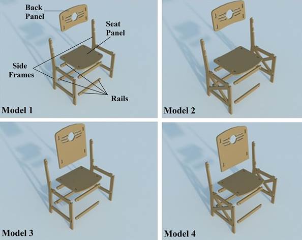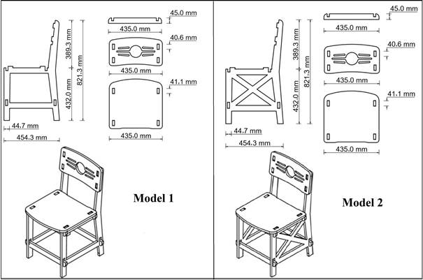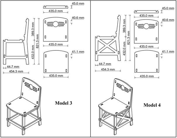 4 different types of chairs were designed without fasteners, including 2 side frame types and 2 backrest connections. Each of 4 chair designs was constructed of 8 members: 2 side frames, 1 seat panel, 1 backrest panel, and 4 rails. Dimensions and technical drawings of chair models are provided in the Figure 1 and 2, as are the dimensions of the members in Table 1.
