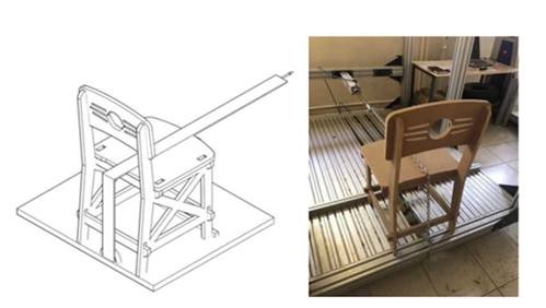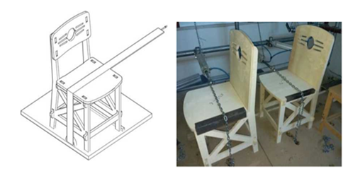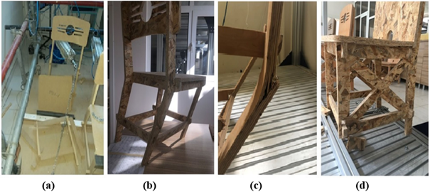 Within the scope of the study, four distinct chair types were designed including two side frame types and two backrest type, produced, and tested under cyclic loading in three different directions (front to back, back to front and side thrust). Three different wood-based panels were used in the production of the chairs: 18 mm thick OSB, MDF, and BPW. As a result, 108 chairs were produced and tested, with 4 chair design models, 3 different wood-based panels, 3 different testing directions, and 3 replications for each group.