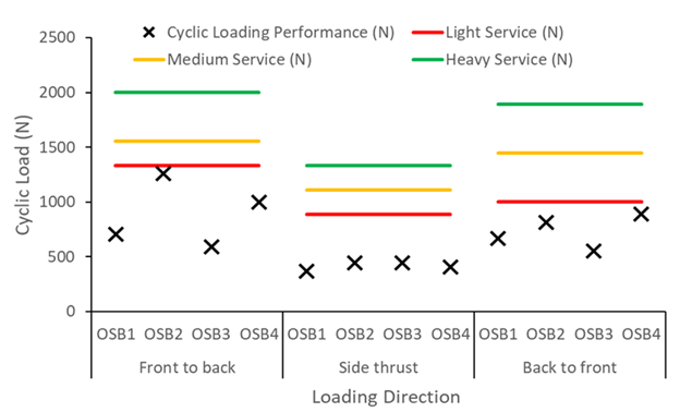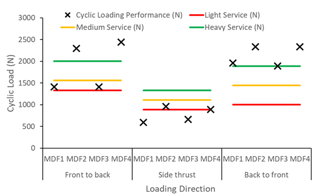 In mean comparisons based on wood-based panel type; BPW chairs demonstrated the highest cyclic loading performance in front to back (2335 N), side thrust (1464 N), and back to front (2094 N) tests. While the chairs constructed of OSB performed the worst (890 N, 417 N, and 732 N), the chairs constructed of MDF (1890 N, 778 N, 2131 N) performed similarly to the BPW chairs under front to back, side thrust, and back to front loading, respectively.