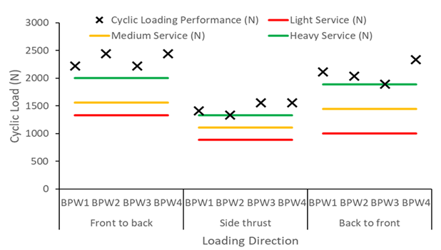 According to the acceptable design loads that were given in ALA specifications, all the chair models constructed of BPW material can withstand cyclic loading performances greater than heavy service loads. Graphs related to the evaluation of front to back, side thrust, and back to front loading performances of four different design model chairs are presented in Figure 13.