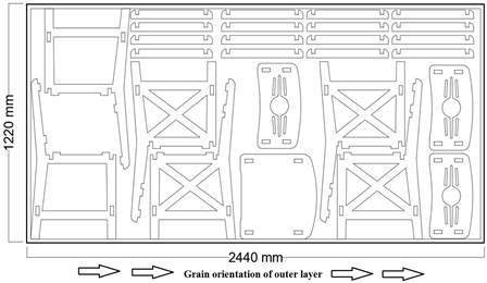 During the chair production phase, technical drawings for all members of the chair models were created in CAD first, and then the drawings of the members were placed on the drawing program in a way that minimized sheet material waste. In both the BPW and OSB samples, it was deliberately oriented the grain of the outer layers to be perpendicular to the chair's height, as depicted in Figure 4. This choice was made to enhance the structural integrity in critical areas, such as the corner where the side rail meets the back post, in order to maximize the strength.