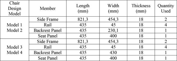 As seen in Figure 1 and Figure 2, the chair model 1 and 3 have no any stretcher in the side frame, while the chair model 2 and 4 have diagonal fixed (X-shape) stretcher in the side frame. In case of the backrests structure; it is seen that the chair models 1 and 2 have short back panels, while the chair models 3 and 4 have long back panels that extend all the way to the surface of seat panel.