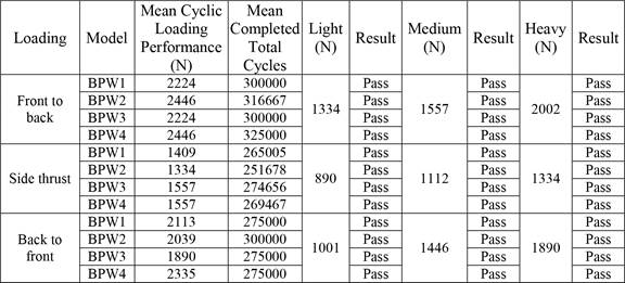 Table 10 compares the cyclic loading performances of four different chair design models constructed of BPW in the front to back, back to front, and side thrust directions with the acceptable design loads that were given in ALA, and shows completed total cycles.