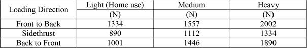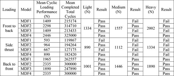 Table 9 compares the cyclic loading performances of four different chair design models constructed of MDF in the front to back, back to front, and side thrust directions with the acceptable design loads that were given in ALA, and shows completed total cycles.
