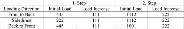 Tests were carried out on the furniture performance testing equipment at the mechanical testing laboratory in the Wood Science and Industrial Engineering Department of Mugla Sitki Kocman University. The test results were then compared to the acceptable load values (Tabla 2) , which were predetermined in ALA as light, medium, and heavy service (Eckelman 1982, Eckelman 1995, Eckelman 1999). Light uses are used in domestic and private spaces, medium uses are not very busy offices, etc. places, and heavy uses are intensive use in hospitals, schools, libraries, airports, and so on. Chairs were loaded in three directions, front to back (Figure 7), side thrust (Figure 8), and back to front (Figure 9). As a result, 108 chairs in 1/1 dimensions were tested in the study. Table 3 shows the acceptable load values determined for the chair performance tests using the ALA test method, and Table 4 shows the initial loads and load increase values.
