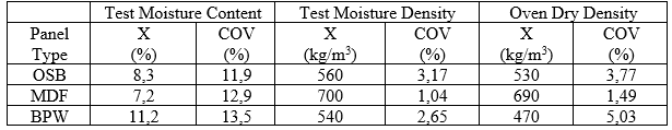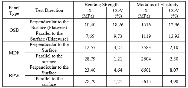 Physical properties such as density TS EN 323 (1999) and moisture content TS EN 322 (1999) of the wood-based panel materials used in the experiments, as well as mechanical properties such as bending strength and modulus of elasticity (flatwise and edgewise) TS EN 310 (1999) were determined in this study using the principles specified in the relevant standards. In the BPW and OSB bending test specimens, the grain orientations of the outer layer were cut to be parallel to the longitudinal axis of the specimens both for flatwise and edgewise.