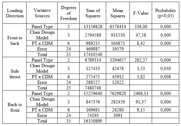 Table 6 shows the MANOVA results for the effects of wood-based panel type and chair design model on cyclic loading performances of chairs in front to back, side thrust, and back to front directions.