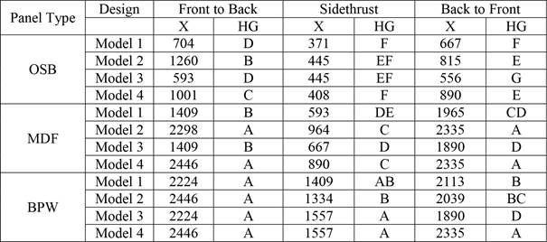 Table 7 compares the effects of “wood-based panel type x design model” two-way interaction on the front to back, side thrust, and back to front cyclic loading performance of the chairs.