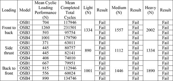Table 8 compares the cyclic loading performances of four different chair design models constructed of OSB chairs in the front to back, back to front, and side thrust directions with the acceptable design loads that were given in ALA, and shows completed total cycles.