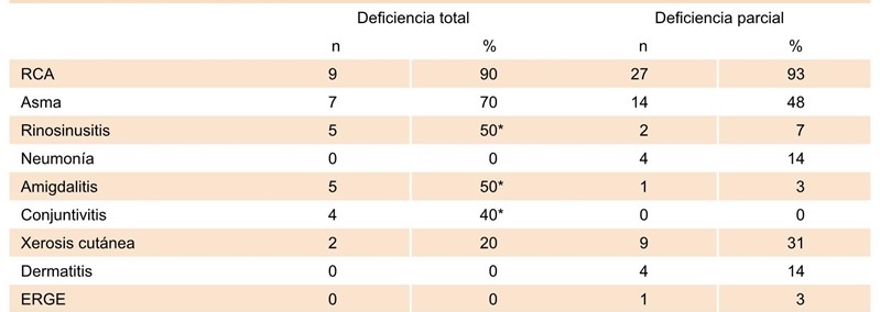 En la investigación realizada se observó que las principales manifestaciones clínicas en la deficiencia de IgA fueron el asma y la rinoconjuntivitis alérgicas. Por otro lado, los individuos con deficiencia total de IgA presentaron mayor número de procesos infecciosos de rinosinusitis, amigdalitis y conjuntivitis, comparados con aquellos con deficiencia parcial de IgA.