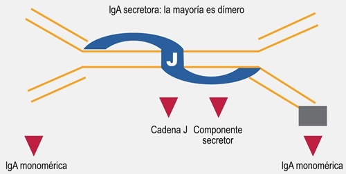 Las moléculas monoméricas de IgA, secretadas por linfocitos B y diferenciadas en plasmócitos sufren dimerización después del estímulo antigénico específico. La IgA dimérica es transportada a través de células epiteliales de la mucosa hasta el lumen de los tractos respiratorio e intestinal, resistiendo la acción enzimática por inclusión de una glucoproteína denominada componente secretor, la cual es sintetizada por la célula epitelial17 (Figura 1). En las mucosas, la IgA tiene como principal función la protección contra microorganismos invasores como los virus y las bacterias. Esta protección es ejercida mediante la inhibición del mecanismo de adherencia de estos agentes patógenos a las células epiteliales.10 Las moléculas de IgA se unen a microrganismos extracelulares, impidiendo que infecten a las células del hospedero, además de auxiliar en la fagocitosis de estos agentes invasores3 (Figura 2).